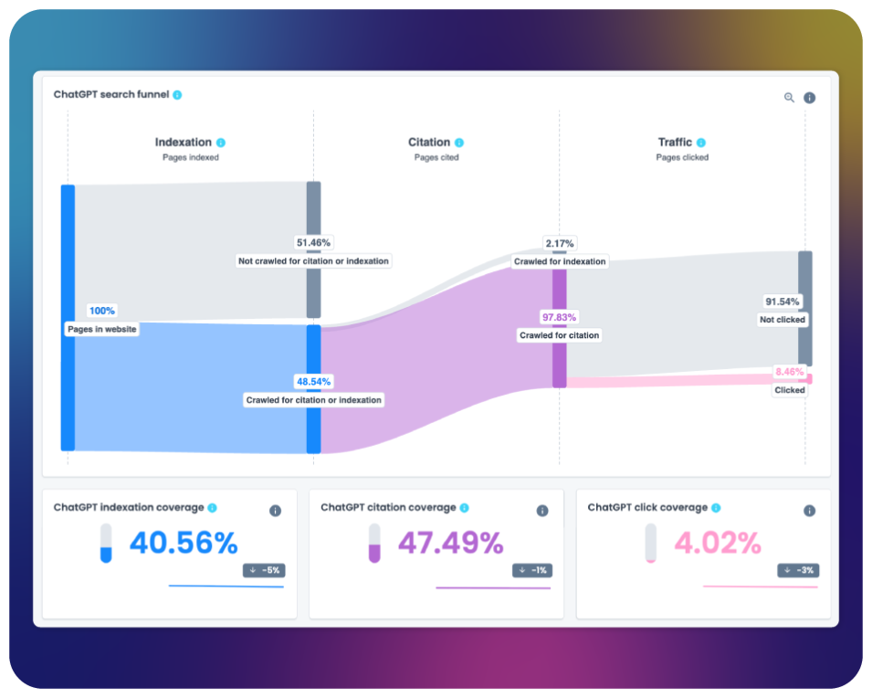 - Indexation : identifie le volume de pages crawlées pour l’indexation ou la citation par les bots IA. Cela permet de repérer les contenus totalement ignorés par l’IA.