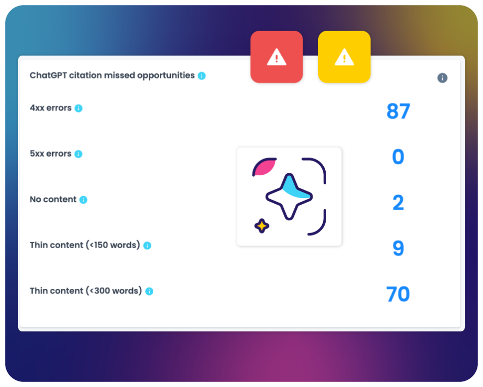 Repérez des quick wins à partir de données réelles. Par exemple, les opportunités de citation manquées mettent en évidence les pages crawlées pour citation par les bots IA mais qui ne peuvent pas convertir à cause de codes d’erreur (400, 500), de contenu manquant ou de contenu trop faible (moins de 150 ou 300 mots).