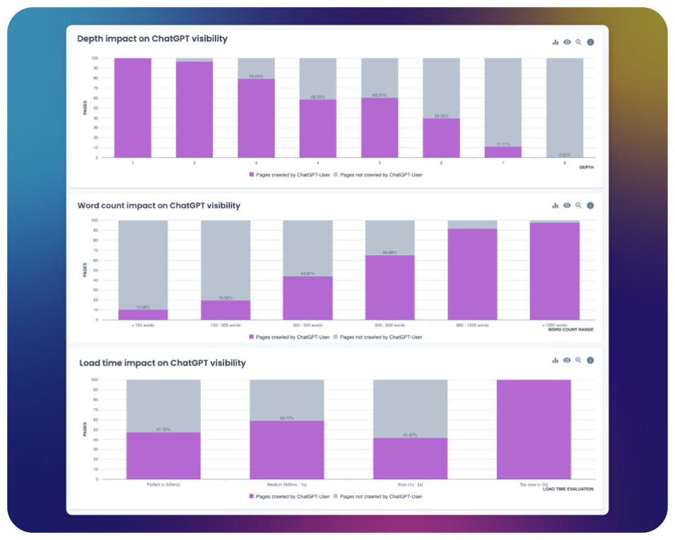 Ce rapport se concentre sur l’activité des bots IA utilisateurs et la croise avec vos données de crawl. Comparez et identifiez des corrélations avec des métriques telles que la profondeur, le temps de chargement, le nombre de mots, la taille des titres, les données structurées ou toute métrique personnalisée issue de votre crawl.