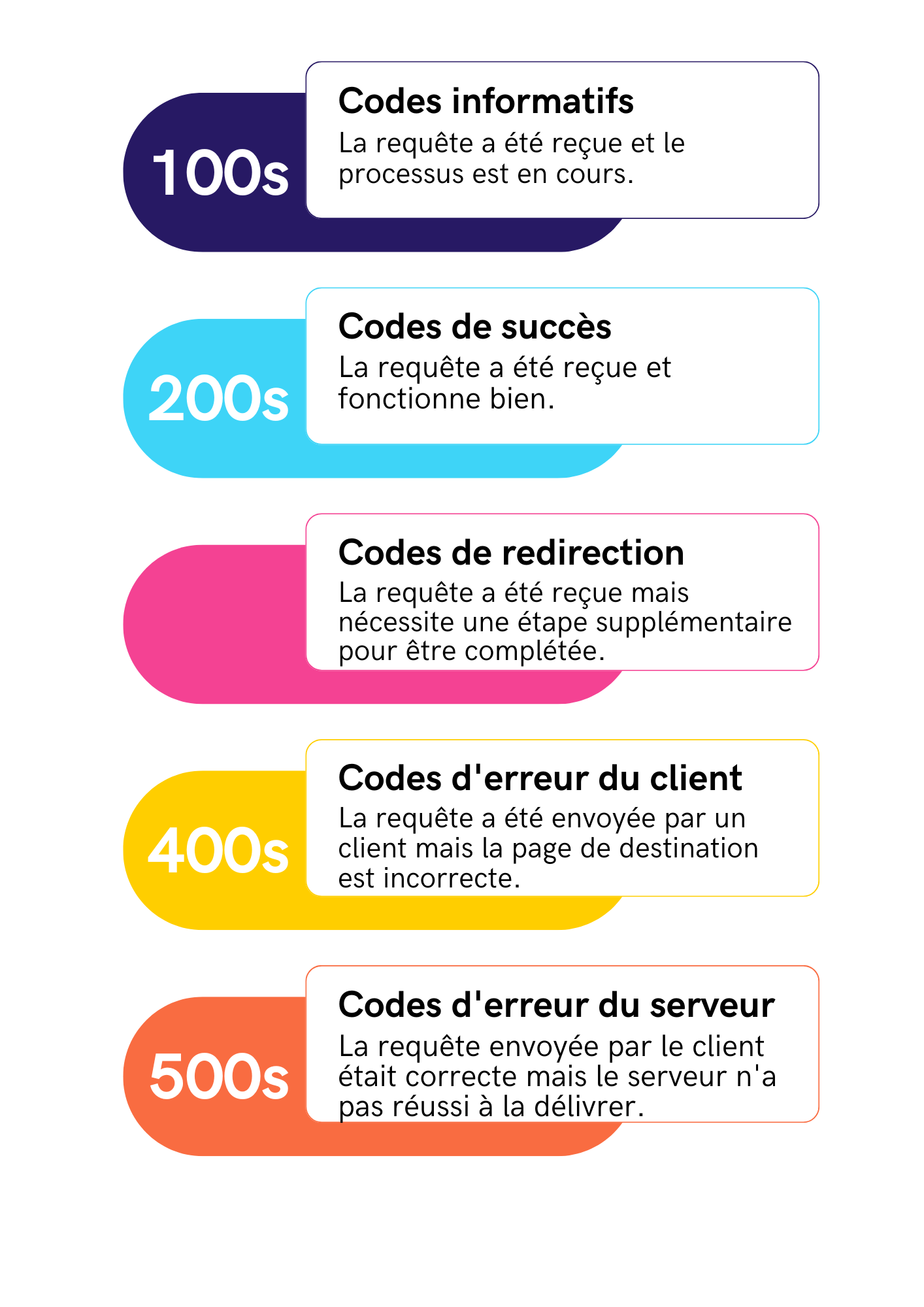 De 100 à 500, les status codes sont divisés selon les catégories suivantes :