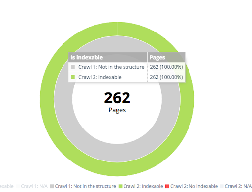 Vous pouvez également identifier les pages qui n’étaient pas dans le premier crawl, mais qui apparaissent dans le second. Ces pages peuvent soit être indexables ou non indexables. Dans la capture d’écran ci-dessous, 262 pages qui n’existaient pas dans le premier crawl ont été créées dans le second et sont désormais indexables.