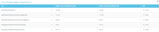 Vous optimisez actuellement vos liens internes ? Vous pouvez vérifier l’évolution de vos liens internes entre votre 1er et 2eme crawl. Vous pouvez également cliquer sur le graphique pour voir quelles pages ont gagné ou perdu des liens internes.