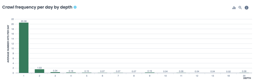 En termes de SEO et d’indexation, les liens moins profonds sont favorisés par les robots d’indexation des moteurs de recherche. Le graphique ci-dessous montre l’impact de la profondeur sur le nombre de fois où les pages de la structure du site ont été crawlées par Google par jour.