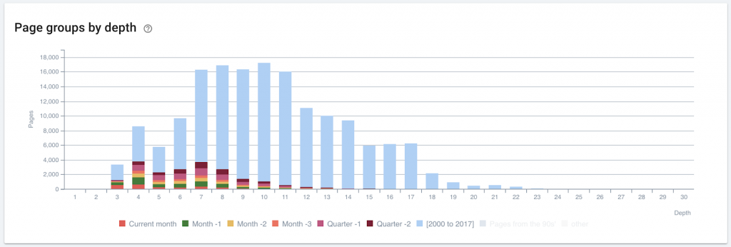 La présence massive de pages plus récentes à une profondeur de 2 est indicative de la promotion efficace de nouvelles pages sur ce site.