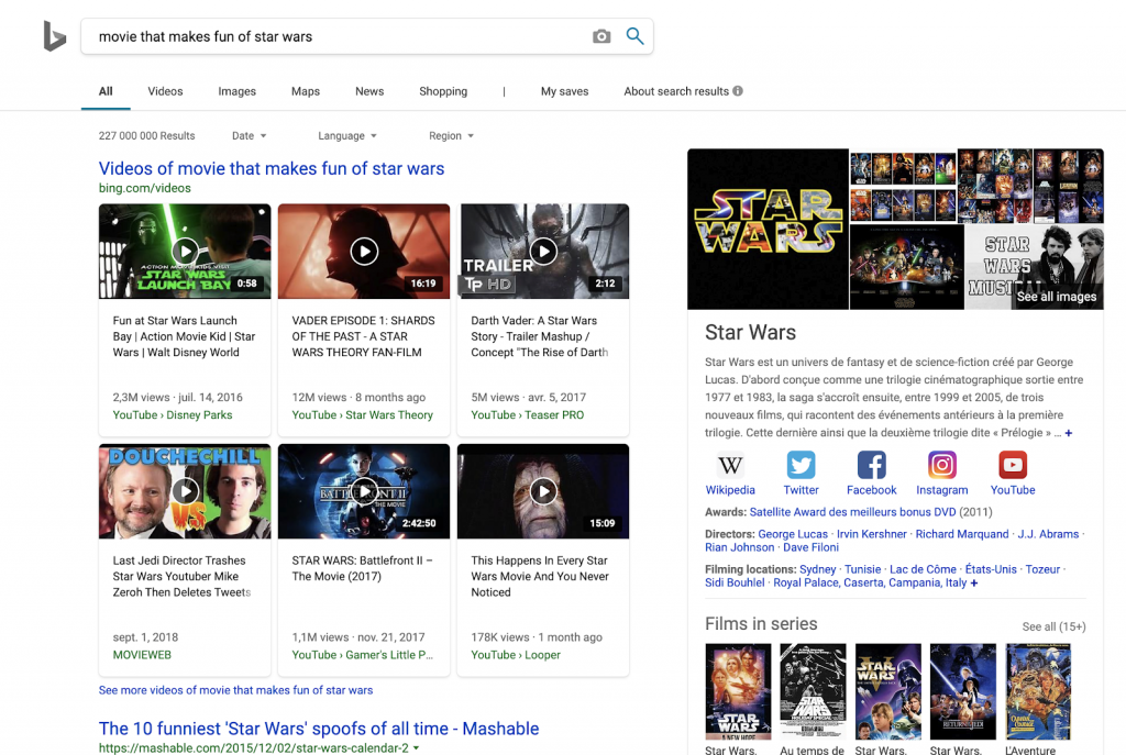 Lorsque quelqu’un recherche [movie that makes fun of Star Wars], Google est capable de comprendre qu’il recherche un filme qui n’est pas Star Wars.